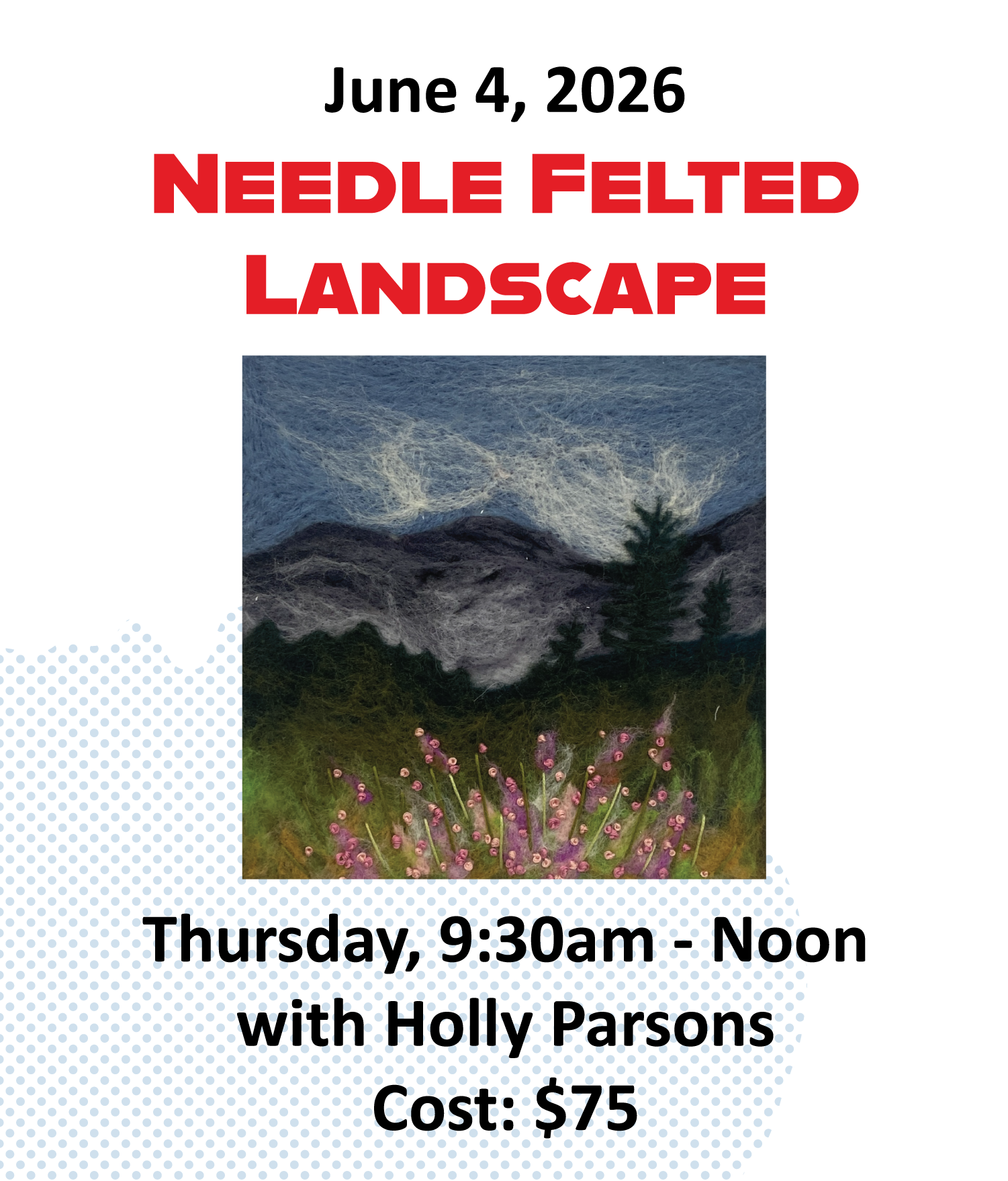 Discover the craft of needle felting in this hands-on workshop as you create a 9” x 9” felted landscape, with the option to add embroidered details. Participants will be guided through the process with demonstrations and individualized support, making it a great experience for beginners and creatives alike.